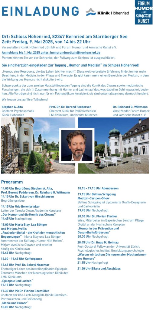 | Freitag, 9. Mai 2025, 14 bis 22 Uhr | Tagung Humor und Medizin. | Schloss Höhenried, 82347 Bernried am Starnberger See | Prof.Dr.Dr. Berend Feddersen (Mit-Veranstalter/ Organisator) Udo Berenbrinker (Vortrag) | Humor und Medizin einladung_kunstundhumor.jpg (1458×2952) |
